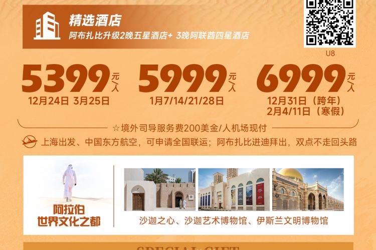 U8--阿联酋“纯享0购物”(升级2晚五星+沙漠冲沙+卢浮宫+亚伯拉罕之家+夜海游船)7日游(PVG-MU)“纯享0购物”阿联酋7日之旅