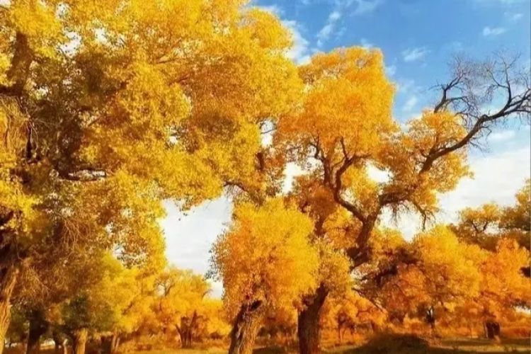 四道桥:胡杨林疏密有序,题材多。四道桥老树窝金色胡杨林,这里有林中蒙古族牧民居住,有洁白的羊群和金色 的胡杨,呈现着安逸的牧人生活场景。