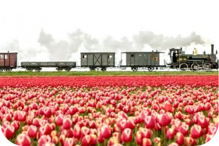 【复古蒸汽小火车】这是荷兰现存的唯一一条还在运行的蒸汽火车,木制座椅,复古红色车厢门,方形车窗,蒸汽火车头,所有这些交织出复古氛围,这是荷兰列车员身着传统制服,仿佛时光倒流至19世纪。火车沿途还会路过郁金香花田,为您解锁花式赏花之旅。参考时刻:10:40—12:05