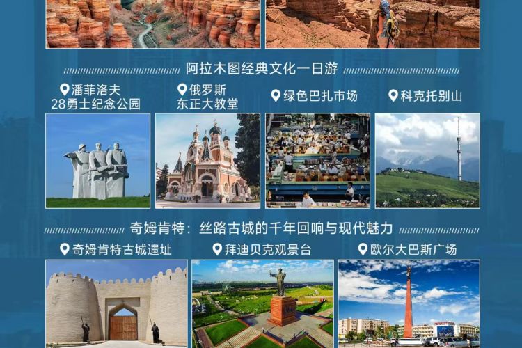 潘菲洛夫28勇士纪念公园、俄罗斯东正大教堂、绿色巴扎市场、科克托别山