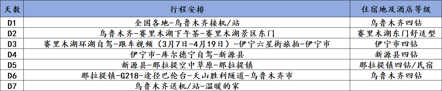 2.3月7日-4月19日出发团期特别赠送赛里木湖跟车视频,不收取额外费用,如因个人原因不参加活动,不提供任何形式的退费,敬请悉知。
