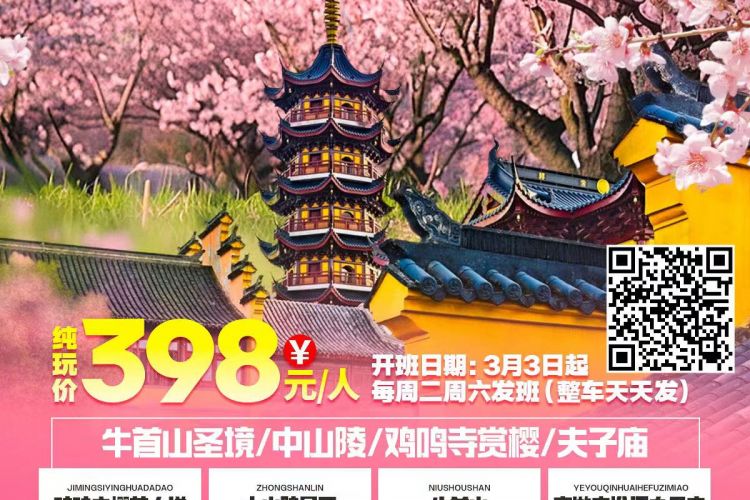 <梦回南京城&鸡鸣寺赏樱>牛首山圣境/中山陵/鸡鸣寺祈福/夫子庙秦淮河 精选1晚商务酒店/赠1早2餐 纯玩2日