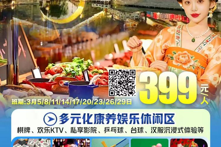 下午对康养客人免费开放娱乐设施:棋牌(每车免费4张棋牌桌)、卡拉OK1场、乒乓球、私享影院、汉服体验等活动;根据时间自愿选择欣赏印象《九九艳阳天》水秀。入住酒店休息。