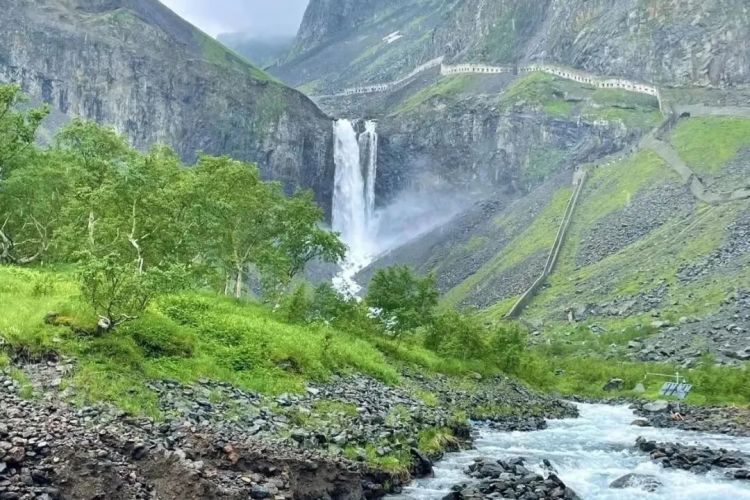 ▲【绿渊潭景区】:因池水碧绿深窘而得名。绿渊潭瀑布飞流直下,最高落差达26米,瀑水落于巨石而四溅,而后流入深潭。每逢雾起,潭上水雾弥漫,与高山岳桦、旷古巨石浑然而一体,美不胜收,恰似人间仙境。