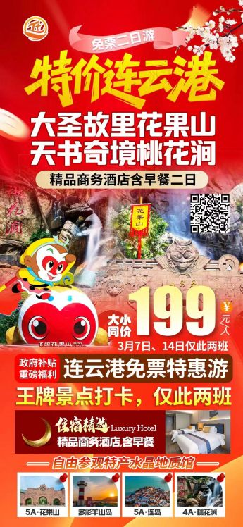 <大圣故里花果山·天书奇境桃花涧>5A·花果山+多彩羊山岛+5A·连岛+4A·桃花涧 精品商务酒店含早餐二日