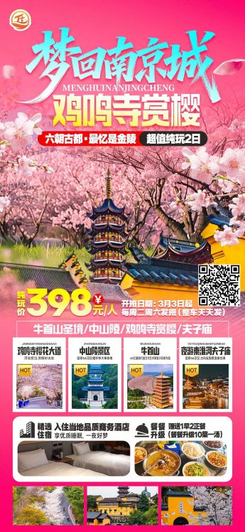 <梦回南京城&鸡鸣寺赏樱>牛首山圣境/中山陵/鸡鸣寺祈福/夫子庙秦淮河 精选1晚商务酒店/赠1早2餐 纯玩2日